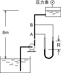 如图所示,用泵将敞口水池中的水送往高位槽,两液面高差8m,高位槽压力表读数为0.1MPa,管路规格Φ56×3mm,总长(包括管件的当量长度)为100m,摩擦系数λ=0.03。U型管压差计两端分别接在出口管路A、B点,A点到B点距离为5m,指示液密度ρA=1480kg/m3,当地大气压为100kPa,如果阀门全开时流量为10m3/h,试求: